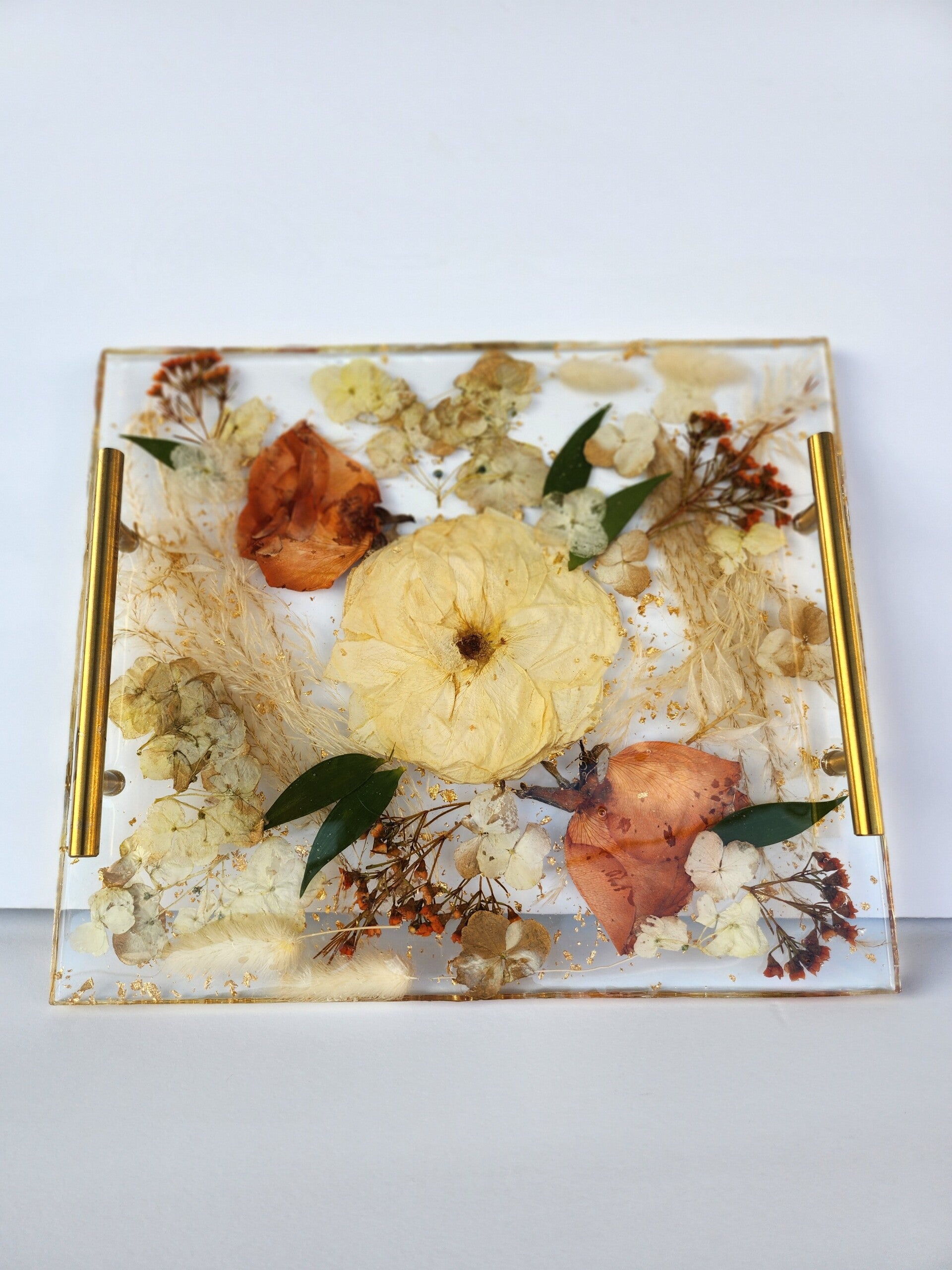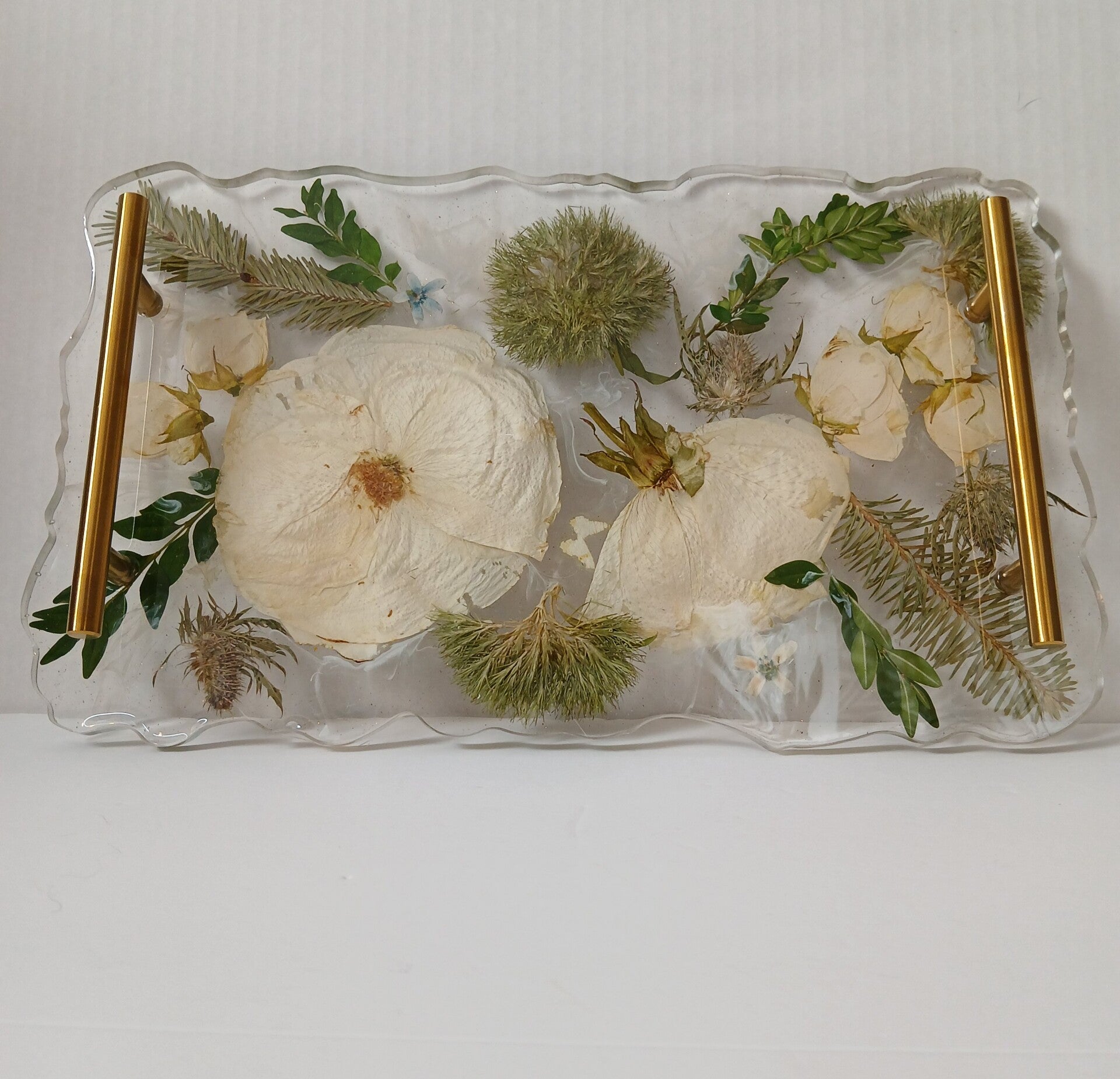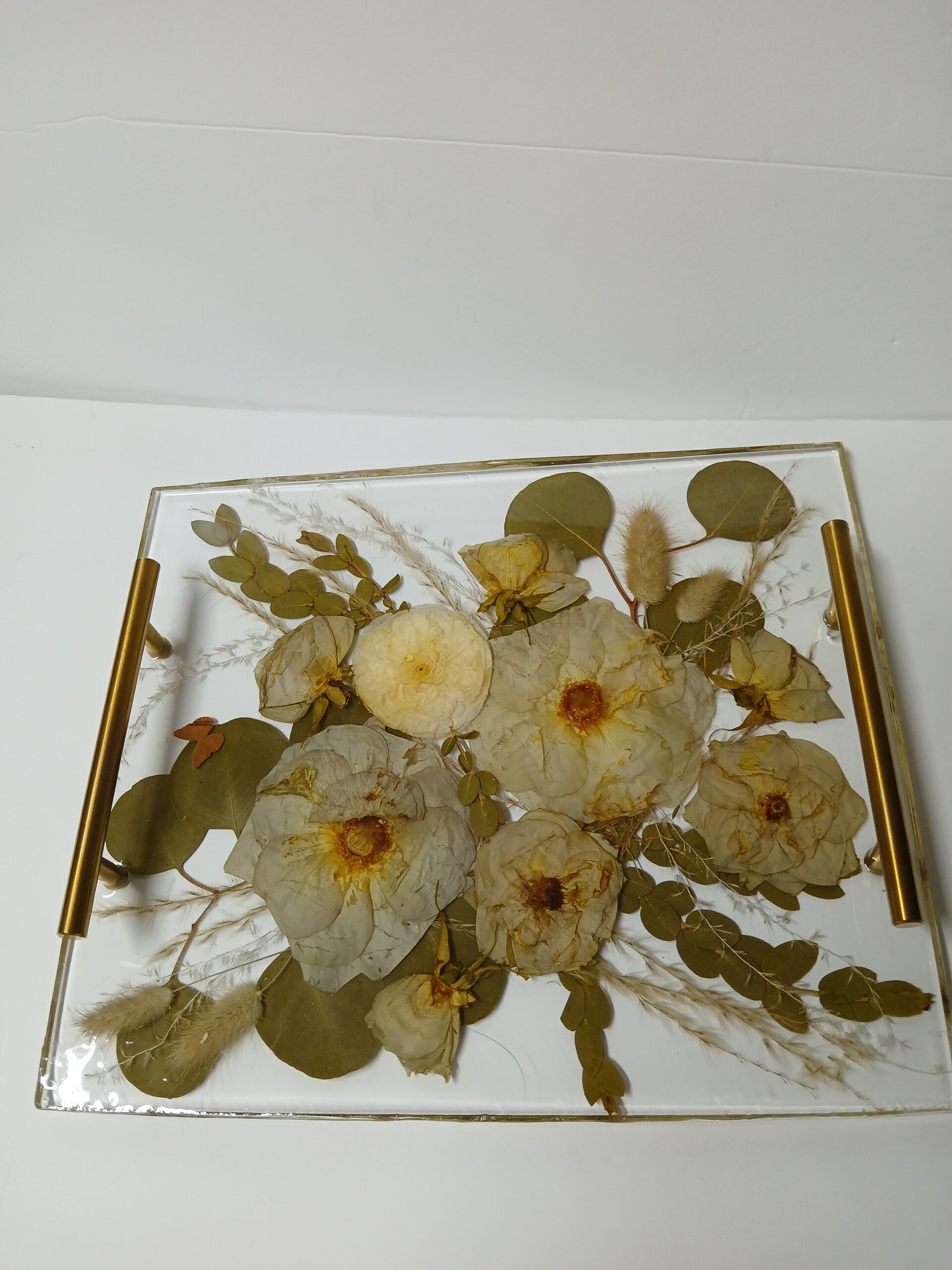 Florals for Trays are flat dried and preserved in resin with choice of handle color.
