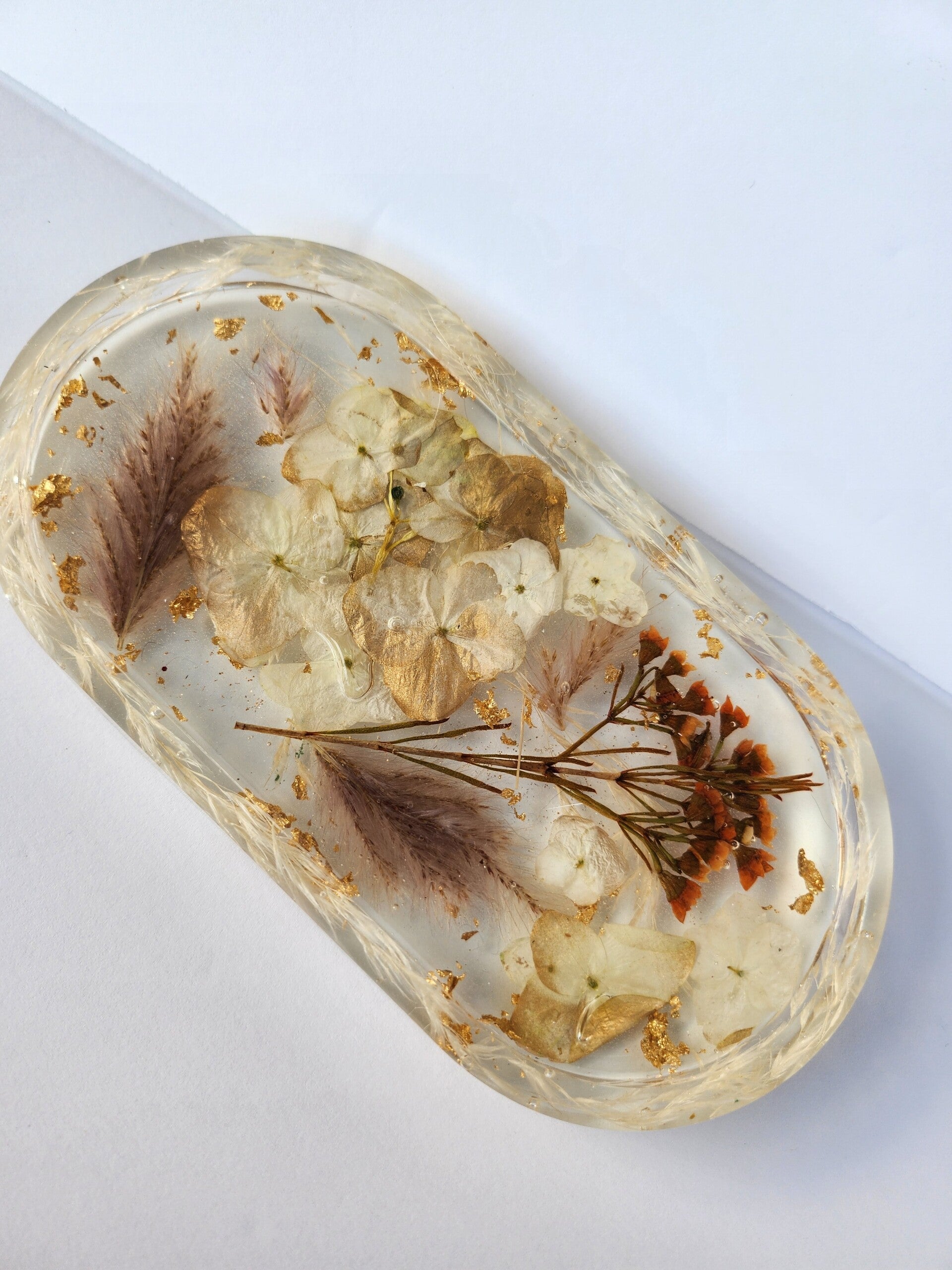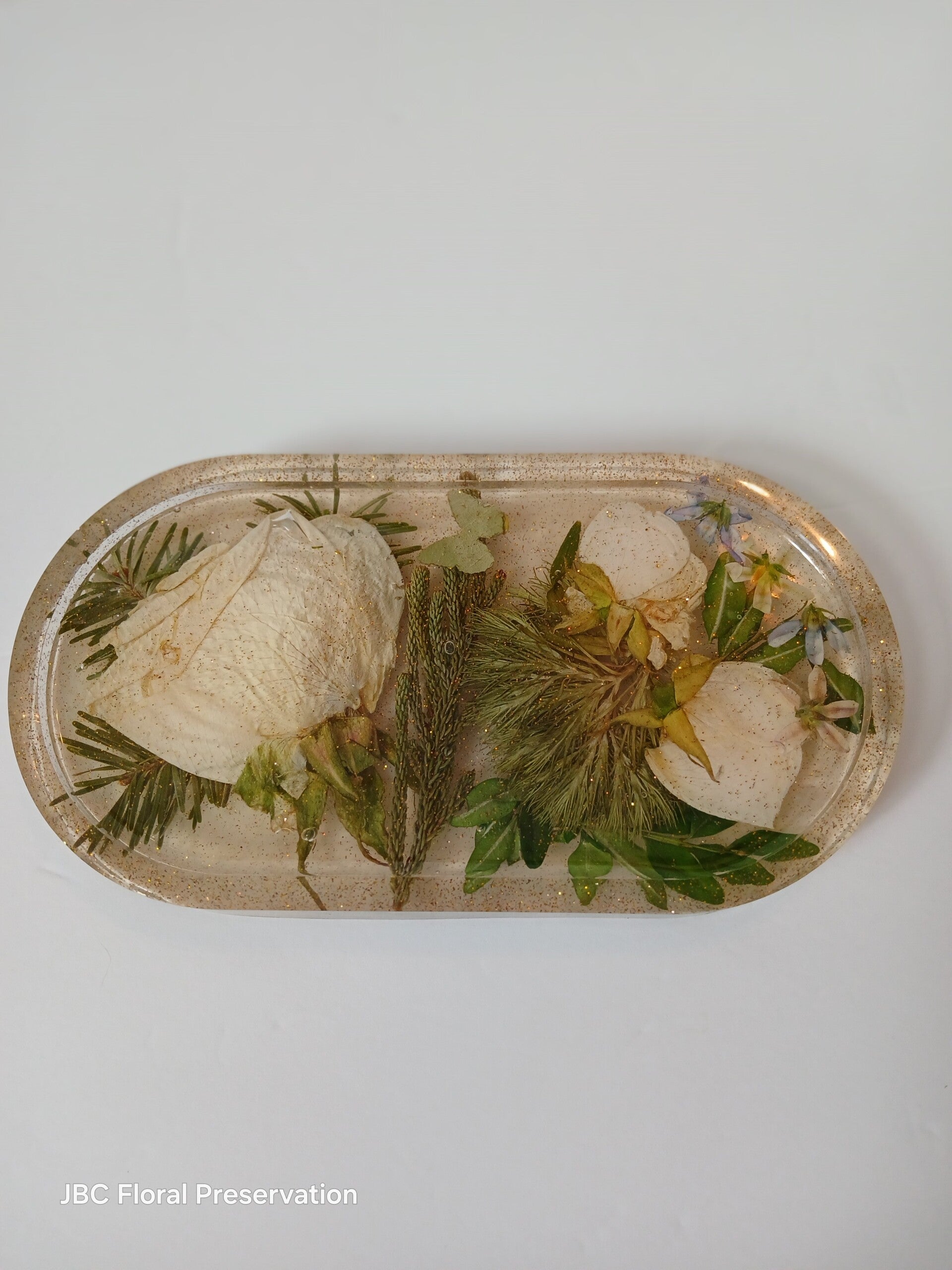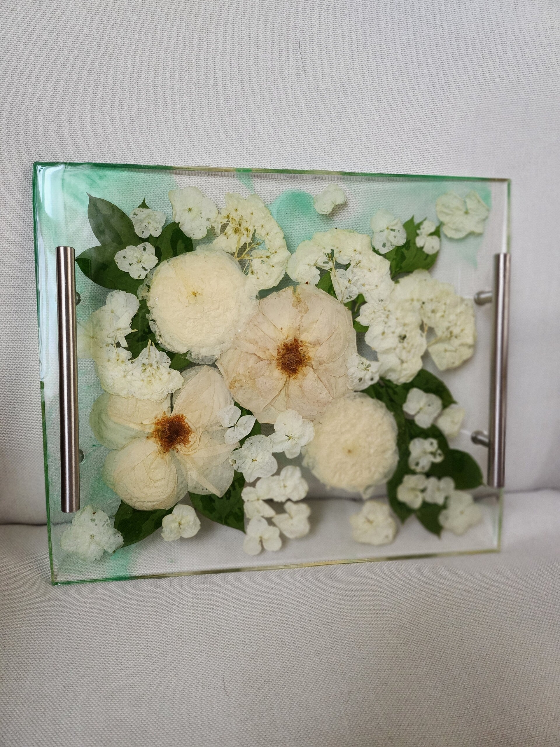 Florals for Trays are flat dried and preserved in resin with choice of handle color.