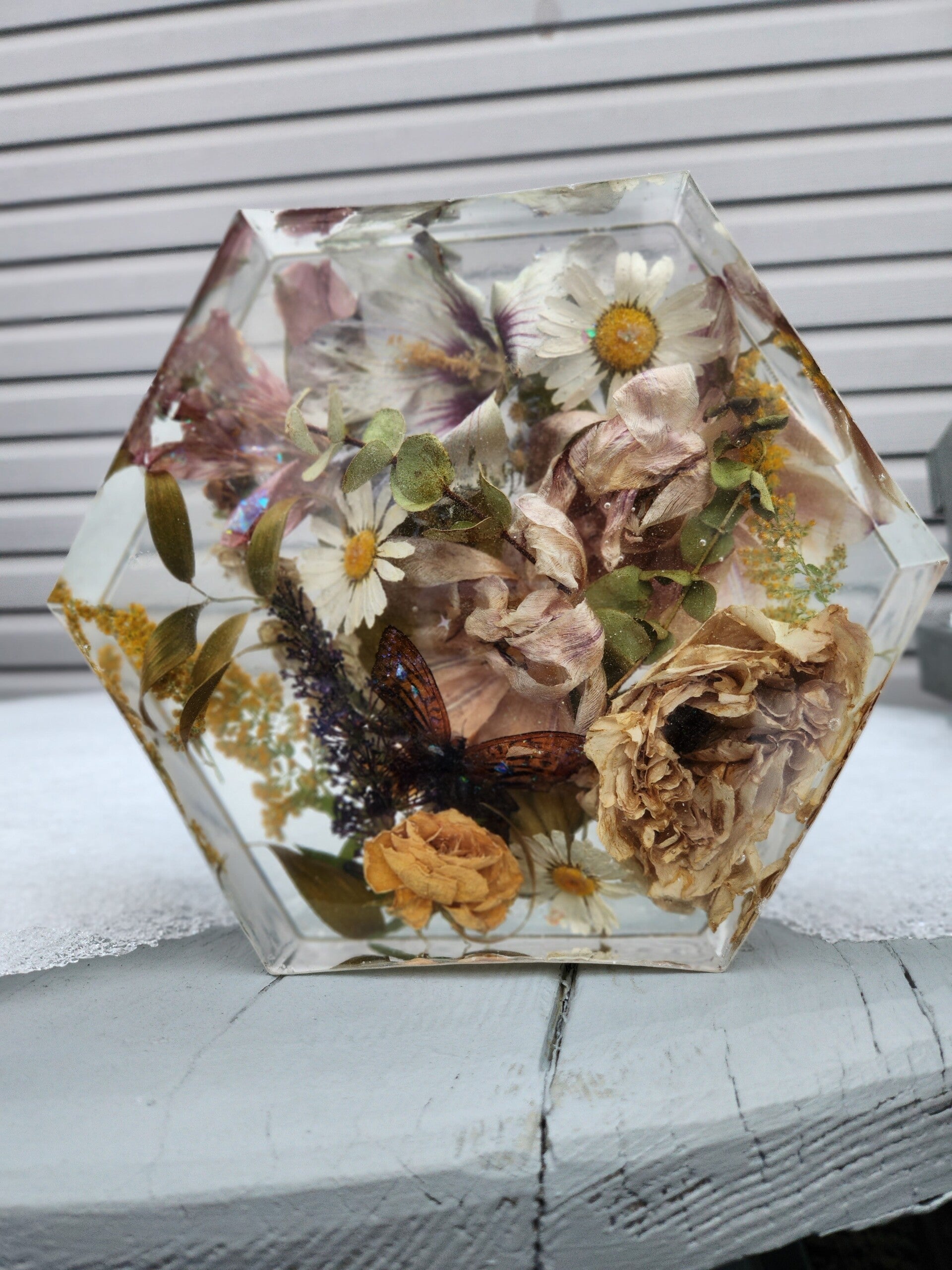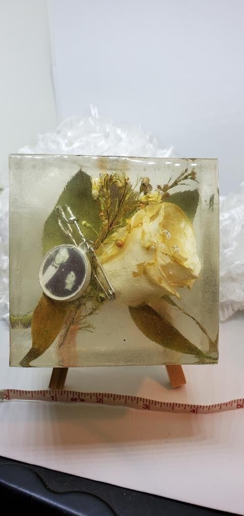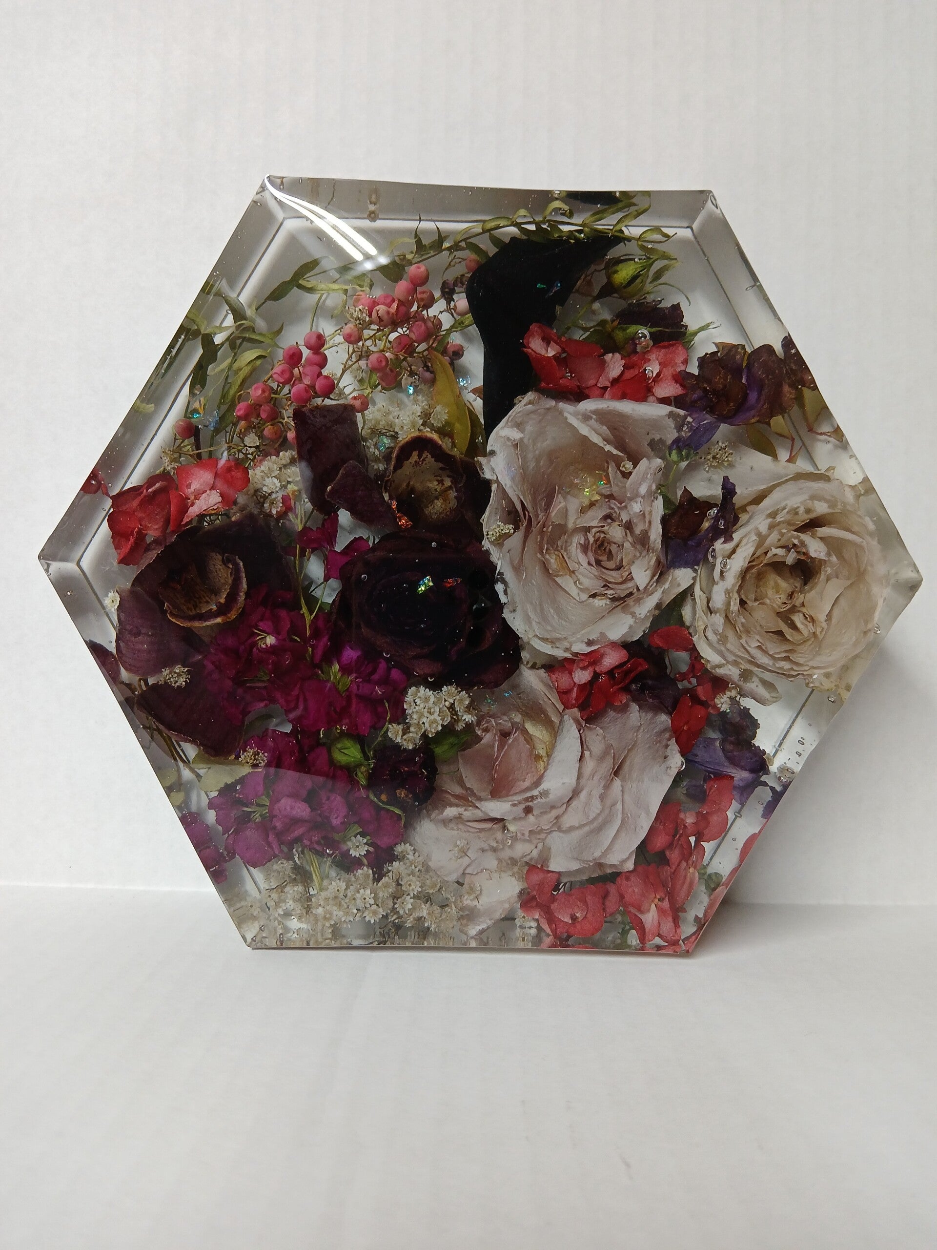 Wedding Bouquet Florals and/or boutonnière's will be dried and preserved in a Resin Block.
