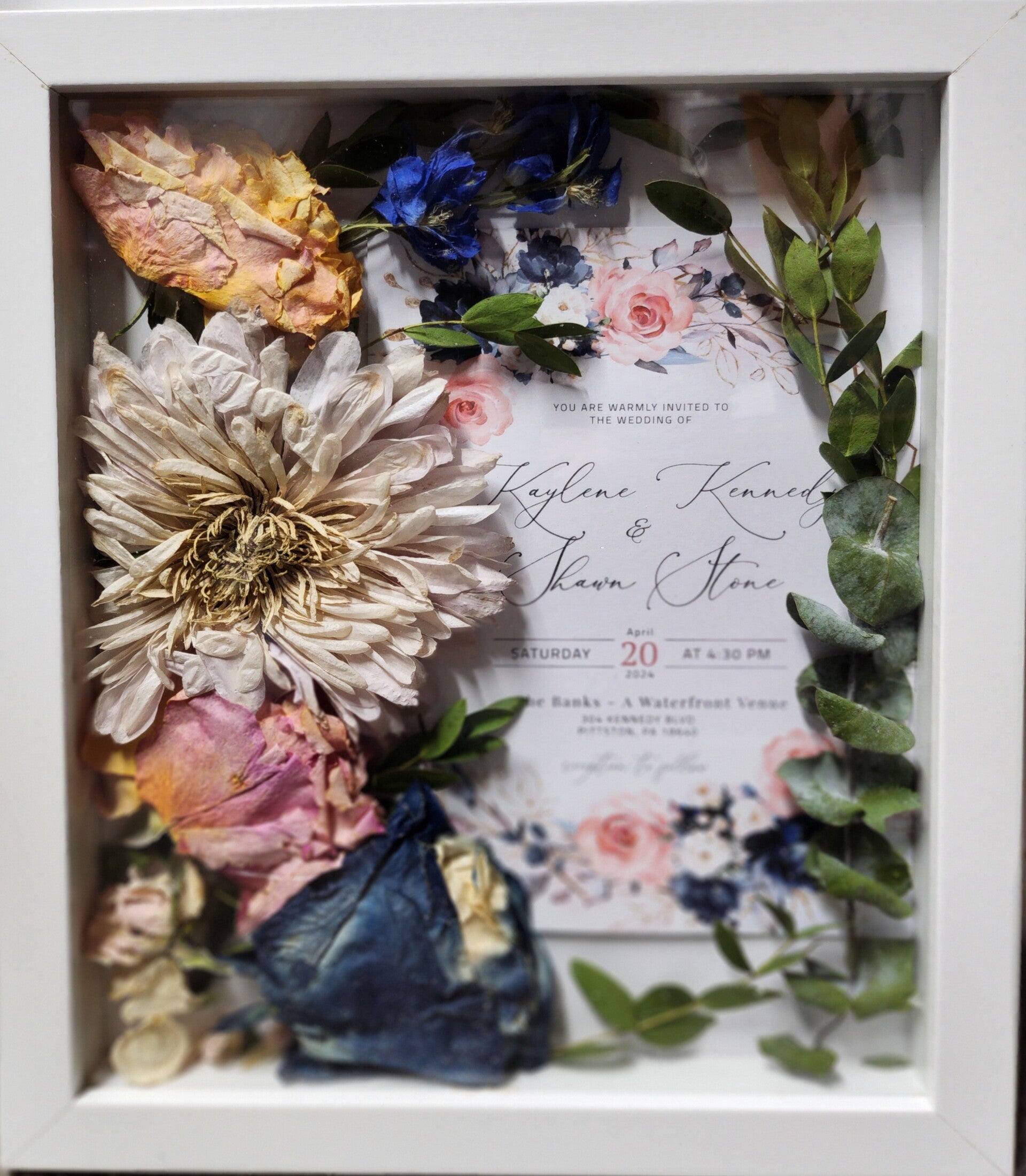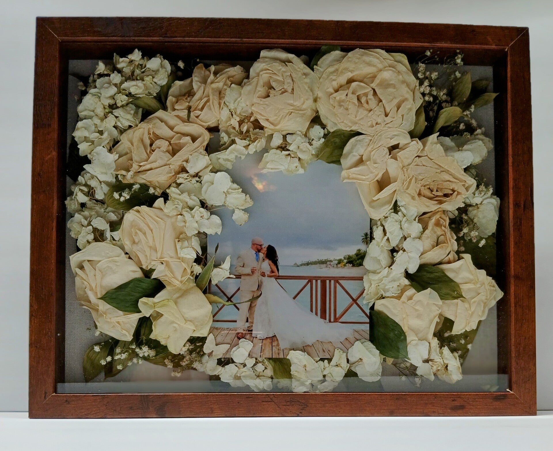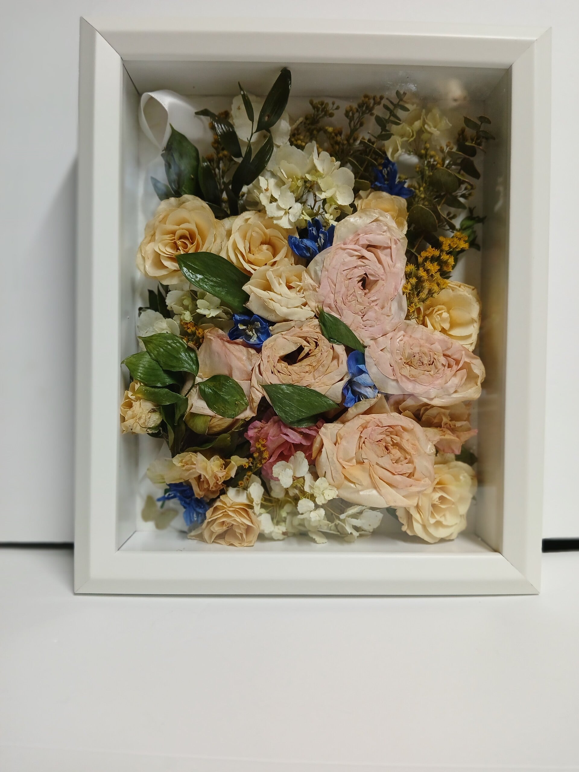 Framed Wedding Florals are flat dried and preserved in a frame of your color choice.